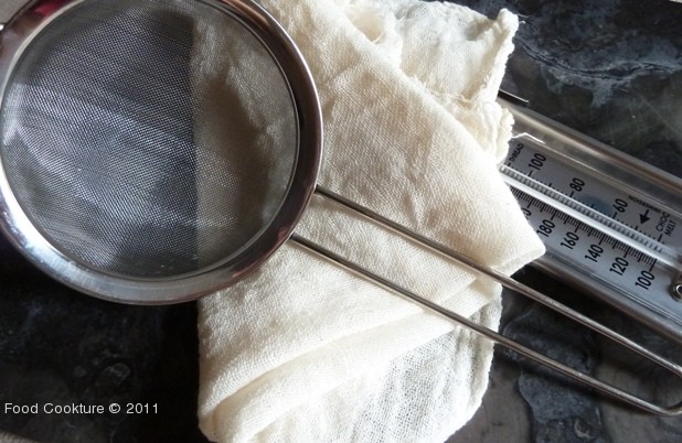 *Note: You can find cheesecloth and cooking thermometer in most house goods stores and supermarkets.  If you don’t have a cheesecloth, a heavy-duty paper towel can be used in its place (once done, be careful not to rip the wet paper towel when removing the ricotta).