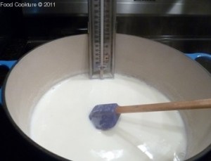 1. Set up the thermometer to the side of the pan (if using one as shown in the picture). Pour milk, cream, and salt into non-reactive pan and stir constantly over medium-high heat, until the thermometer reads 175°F/80°C.