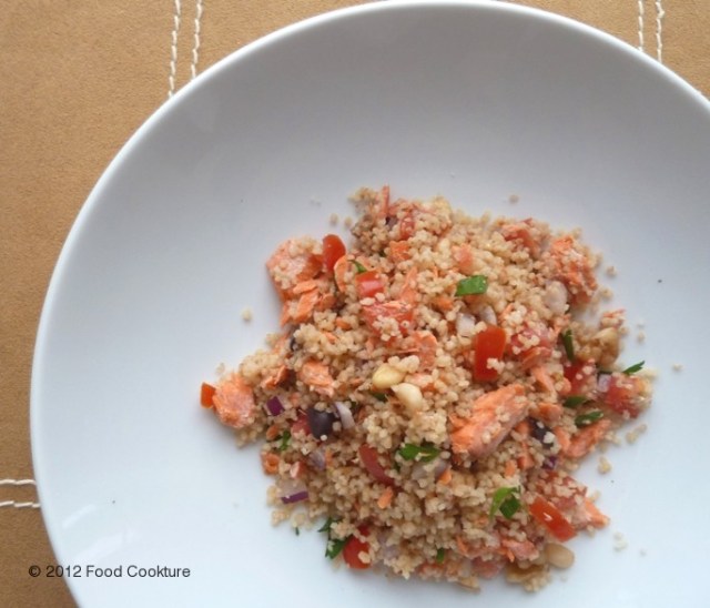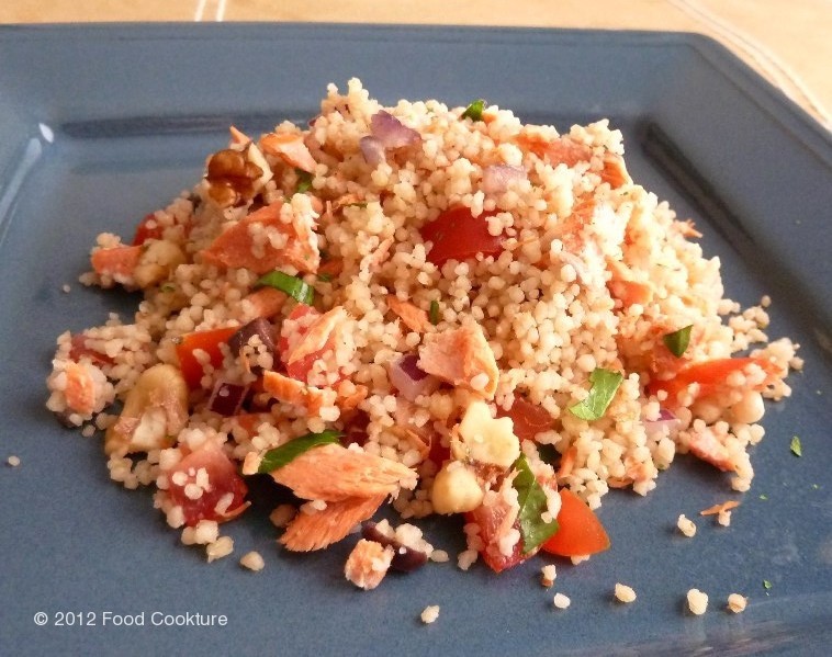 I often make couscous because it’s quick, easy and delicious by itself (with a little salt, pepper and olive oil) or you can add any fresh ingredient and make a more elaborate side dish or a main meal with it. I first had this salmon couscous dish about 3 years ago at my friend Anailza’s house and loved it; it’s light, fresh, and nutritious and can be eaten hot or cold. I have made it often since, sometimes changing ingredients. This recipe has approximate quantities of ingredients, because there is no need for specific measurements (except in cooking the couscous itself). You can add as much or little of something listed, omit or substitute with another ingredient of your choice; you can even cook the couscous in vegetable stock instead of water. This is simply a suggested recipe, and I urge you to experiment on your own making couscous with other flavors and you too will see how easy it is to make a great nutritious meal with this simple ingredient!