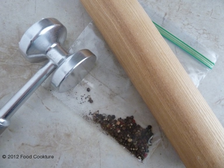 - Crush the black peppercorn using a mortar and pestle, or place peppercorns in a small plastic bag and crush using rolling pin (roll over peppercorns) or a meat tenderizer (make sure to use a cutting board or protective surface underneath). The crushed peppercorns might pierce through the bag, so you can also cover the bag with a dish towel. Place the crushed peppercorns in the same bowl with the grated cheese.