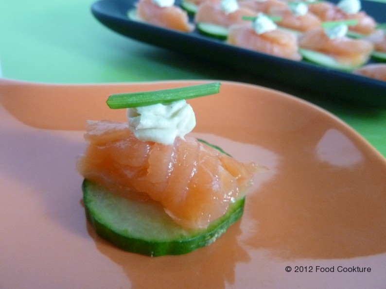 Smoked salmon is wonderful over bread, toast or crackers; but when served over cucumber, it creates a lighter and gluten-free alternative to the standard canapé. Cream cheese also pairs well with smoked salmon and in the US this duo is often served with bagels and even in sushi (as in the famous Philadelphia roll). Combining cucumber and smoked salmon in a canapé gives a fun twist and a healthier alternative to serving a carb-based appetizer.