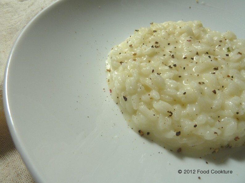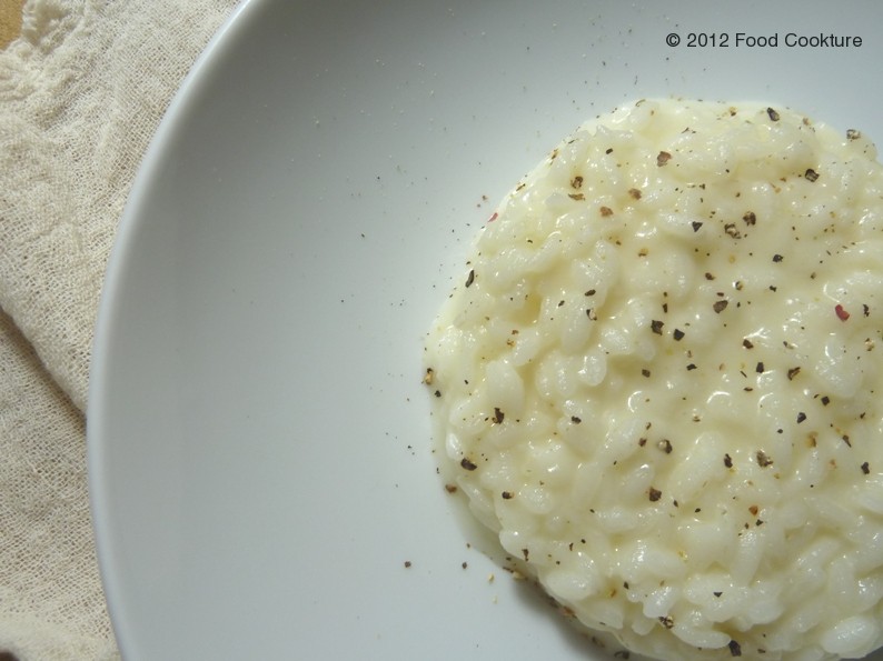 The Northern Italian region of Emilia-Romagna was greatly affected by the earthquakes of May 20th and 29th. Well-known for its traditional regional cuisine and infamous local products (such as Parmigiano Reggiano, prosciutto di Parma, and Aceto Balsamico Tradizionale di Modena, to name just a few), the region has hundreds of regional farmers that were affected and many small artisan companies that were damaged during the earthquakes. Many people bought stranded wheels of Parmigiano Reggiano online that would otherwise have no home to age in. To thank people for their support, the Parmigiano Reggiano Consortium created the “Parmigiano Reggiano Night” which invited homes around Italy to take part in the webcasted dinner event that shared a recipe by Modena native and world-renowned Chef Massimo Bottura, owner of the Three Michelin “Osteria Francescana” restaurant in Modena, Italy. Chef Bottura created a risotto recipe to be shared at the “Parmigiano Reggiano Night.’ His “Risotto Cacio e Pepe” (cheese and pepper risotto) uses Parmigiano Reggiano cheese as the highlight ingredient, instead of the traditional Pecorino Romano for the “cacio” (see my previous recipe for “Spaghetti Cacio e Pepe” for more information). Click here to see a brief interview with Chef Bottura explaining the inspiration for his dish.